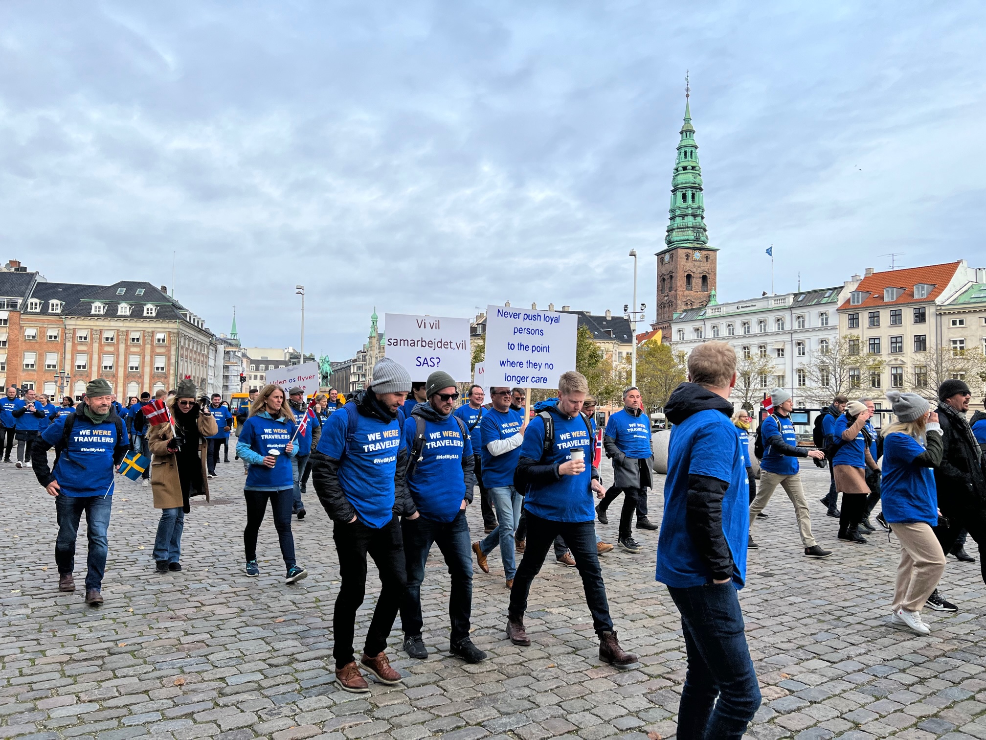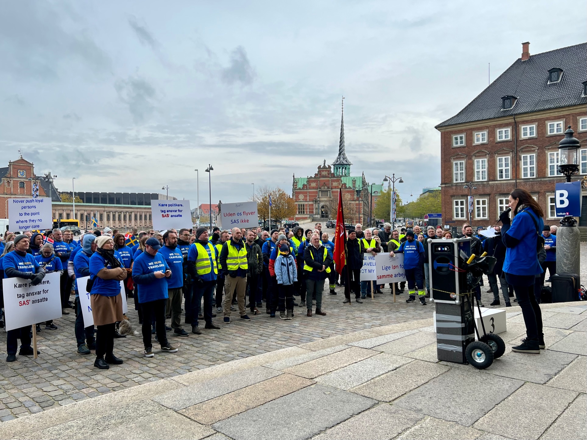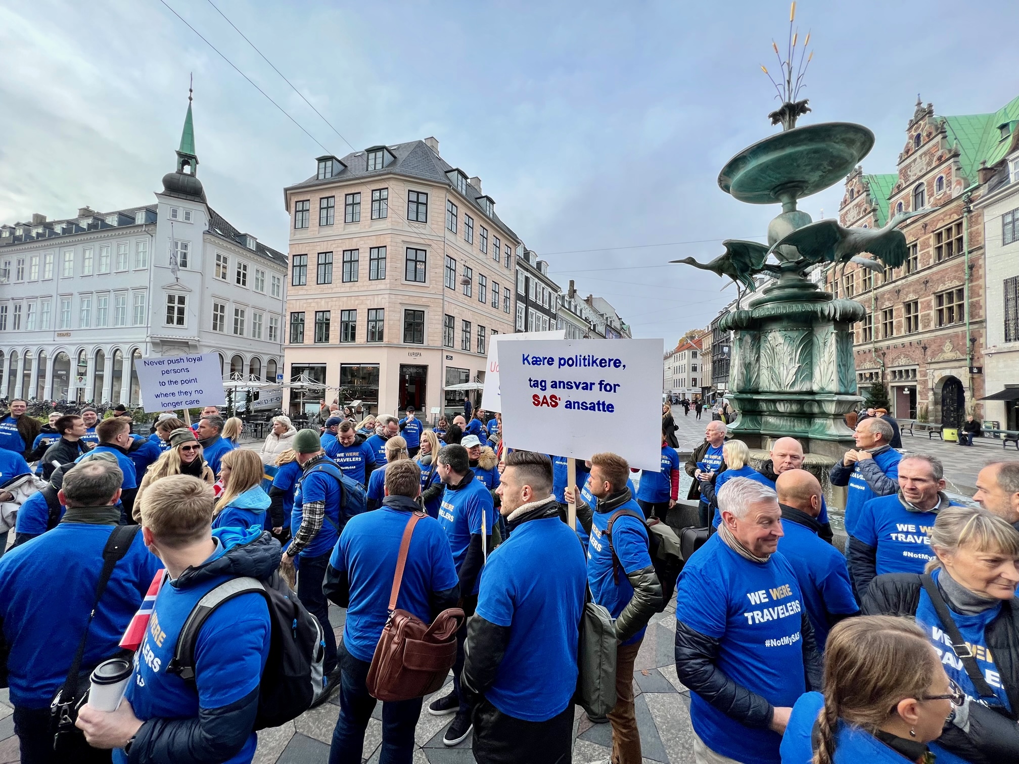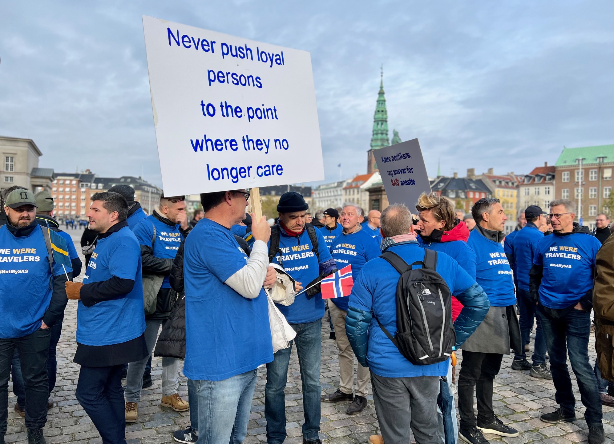 Torsdag 4.10 møttes 400 – 500 tidligere- og nåværende SAS-ansatte utenfor det danske Folketinget ved Christianborg i København for å protestere mot SAS-ledelsens agerende mot sine egne ansatte.